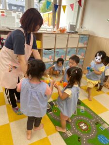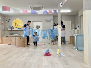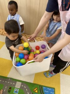 初めは戸惑っていた1歳児さんたちも少しずつ理解してボールをカゴの中に入れることができましたよ👏