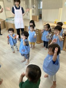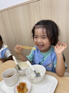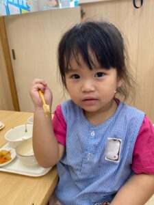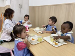 0、1歳児のみんなも給食をもりもりと食べています😆