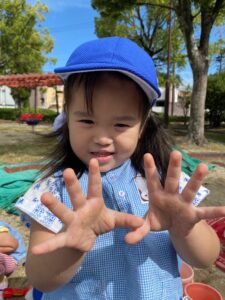 砂のケーキを作っていたら手のひらに砂がたくさん付いたのが面白かったようです🤭