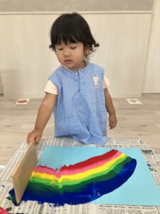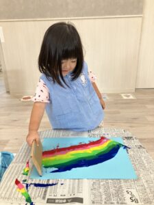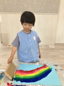 画用紙に絵の具をおき、段ボールで絵の具を滑らせて虹を作りました🌈