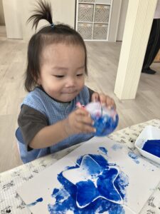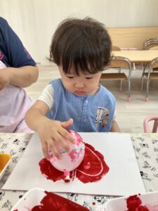 0、1歳児さんはステンシル製作をしました。星⭐️、ハート❤️、クマ🐻の中から好きな型を選び風船でスタンプをポンポンと押していきました☺️