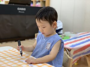 2歳児さんは、絵の具をつけたビー玉を転がして模様つけ✨
