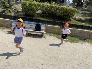 地面に大きく〇△□を描き、先生に言われた形の中に移動するゲームです🏃🏼♂️
