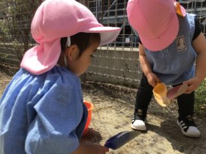お砂場でケーキやプリンを作るお友達。美味しそう😋
