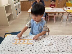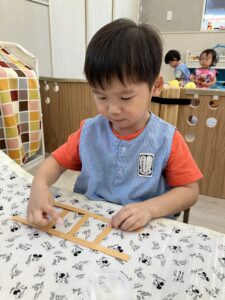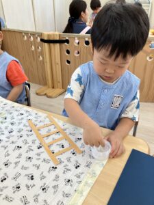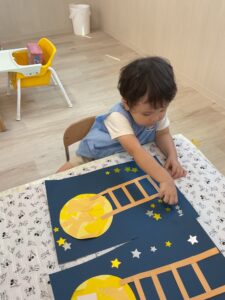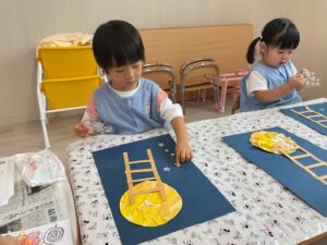お月様を作った後は、お月様にハシゴを掛けました🪜ハシゴを渡すと指にのりをつけて、ぬりぬりと一本の指に少しだけのりを付けて上手にハシゴを貼っていました☺️