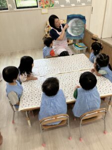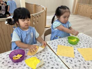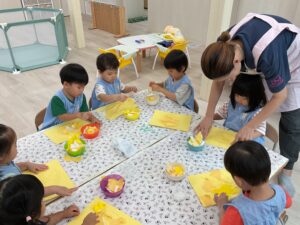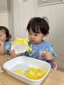 2歳児さんは「パパおつきさまとって」の絵本のお話を聞いてから、丸いお月様を作りました!初めは黄色と薄黄色の折り紙を細かくちぎりました。上手に保育士と一緒にビリビリとちぎるのを楽しんでいました♪