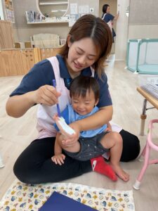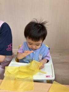 0、1歳児さんは花紙をビリビリと破ることに挑戦✨指先を使って上手にビリビリと破ることができていました☺️難しいお友達は先生と一緒に花紙をやぶっていきました!