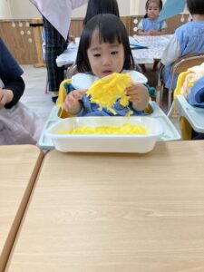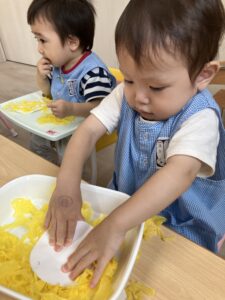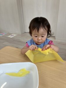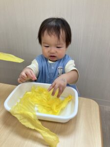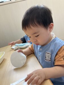 破った花紙が入った箱の中に丸の画用紙に両面テープをつけたのを入れ、画用紙に花紙をつけていきました!両面テープを上手に剥がし、画用紙を花紙が沢山入っている箱にぎゅとすると花紙が沢山ついてとっても嬉しそうでした♡