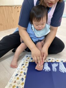 足形もとりました👣足に筆で絵の具を塗りました!筆で塗られるのがこしょぐったかったようで、笑いながら足の指を動かしていました😂