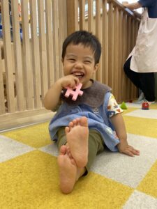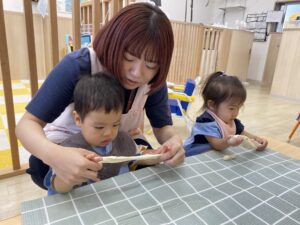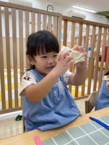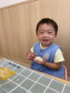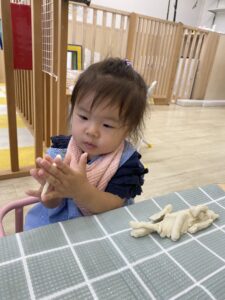 いつもの粘土と違った感触に気づいて嬉しそうな1歳児さん💕