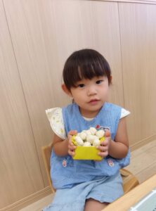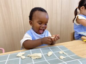 今日は夏が戻ってきたような天気だったので、お散歩は控えてお部屋で小麦粉粘土をして遊びました。