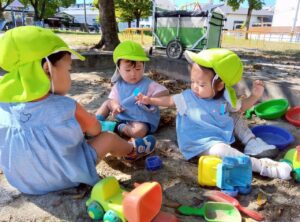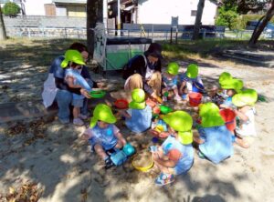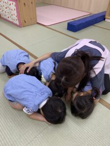 保育者が、「ガタガタ!地震だよ。ダンゴムシさんになって頭を守ろうね。」と声掛けをすると、