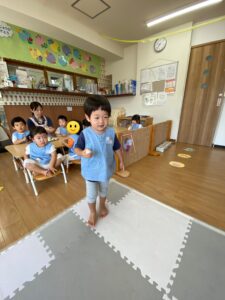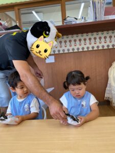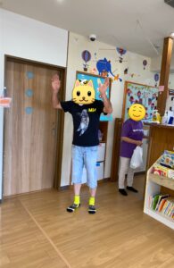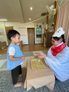 園長先生がお地蔵さんになってお菓子を持ってやってきてくれました😳