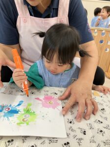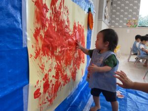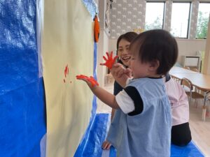 絵の具が入った箱に手を入れオレンジ色の絵の具をつけたら、壁に貼ってある紙にペタペタ✨手についた絵の具をじーっと見つめる子や楽しそうに何度も絵の具をつけては手形を押すことを楽しんでいるお友達も😊