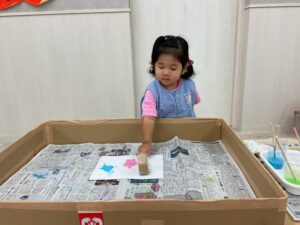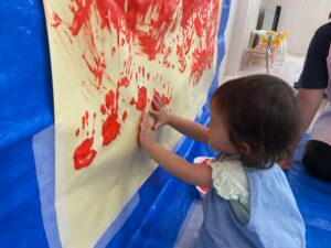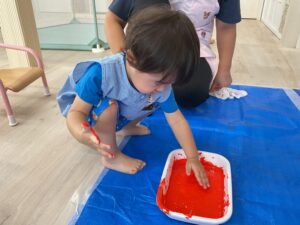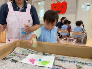 最初は難しくなかなかボールに当たりませんでしたが、何度か叩いているうちに当たるようになり上手に絵の具が飛び散ると嬉しそうにしていました♡