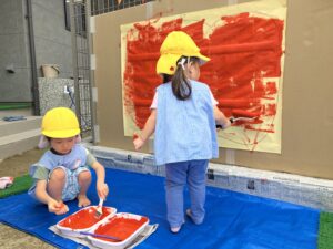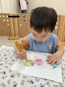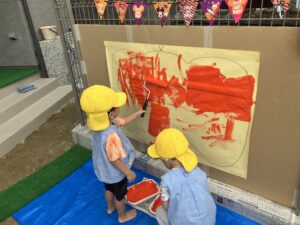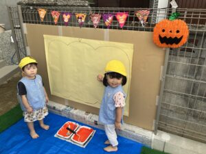 2歳児さんは園庭で大きな紙に描いてあるカボチャの中をローラやハケで色を塗っていきました!お友達と楽しそうにお話ししながらカボチャに色を塗っていましたよ🎃