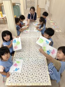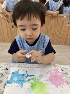 絵の具を溶かした水の中にデコレーションボールを入れ、色をつけたら白い画用紙の上に乗せて上からトンカチで叩いて絵の具が飛び散る様子を楽しみました🔨