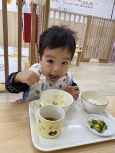 1歳児さん、スプーンを使って一人で上手にもぐもぐ…。