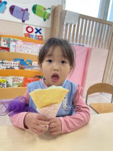 お寿司がもらえると「ありがとう!」と笑顔で伝えるりんご組さん!素敵です!