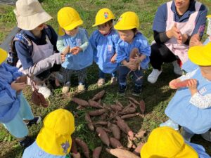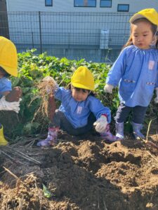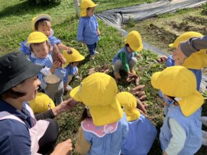 畑までは先生やお友達と「おいも大きいかな?いっぱいあるかな?」と