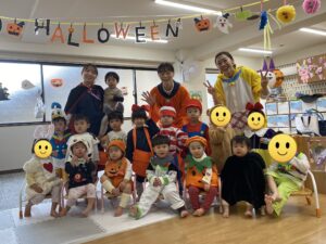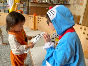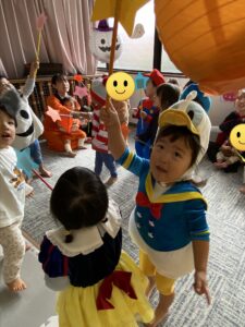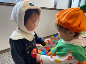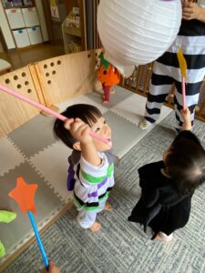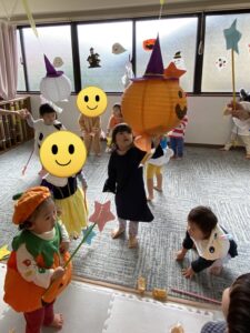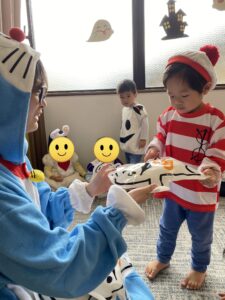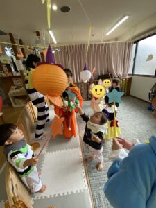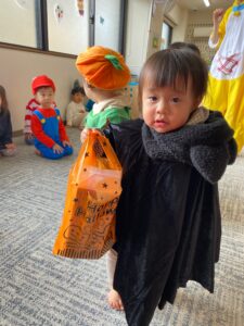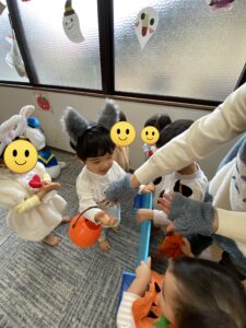 くんたん先生が「トリックオアトリート!」の言葉を教えてくれたので、みんなで扉をノックノックノック!と叩いてみたりトリックオアトリート!と言ってなりきって楽しんでいましたよ👻