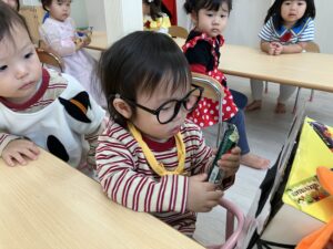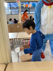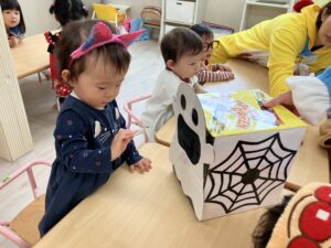 英語活動の後は、おばけの口に慎重にそーっと手を入れると👻