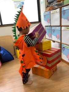 かぼちゃとおばけのカードの中から一枚引き、出たマークの付いた積み木を探し、倒さないように積み上げました!