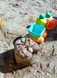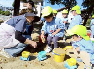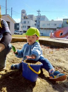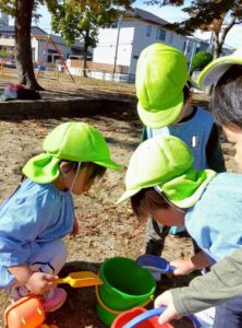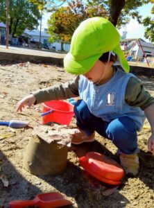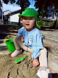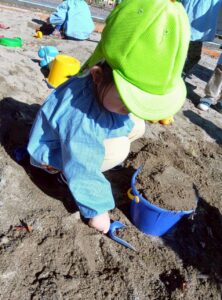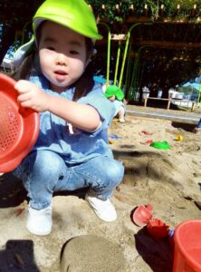 砂を協力してジャー!と入れたり、ダンプトラックの玩具で運んだりして楽しみました🎵