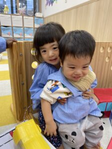 「大好きだからぎゅーしたい!」と1歳児さんをぎゅっとする2歳児さん🥰
