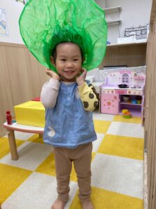 カラーポリ袋を頭に付けて「きのこみたいでしょ〜🍄」と遊んでいます🤣