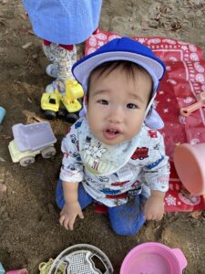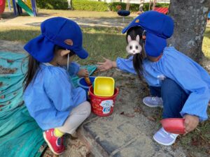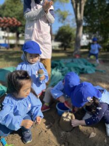 「お砂糖もかけよう!」と2歳児のお姉さんたちはサラサラの砂をたくさん集めています😌