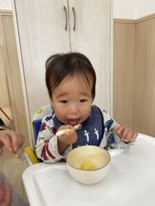 お給食の前に2歳児さんたちがお芋掘りで取ったさつまいもを見ました🍠