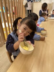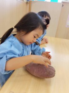 「このお芋が美味しいおやつに変身するよ」と伝えると目を輝かせてワクワクしている子どもたち🧒