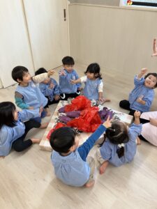 焚き火の準備ができたら、自分の作ったお芋を並べました🍠火に見立てた赤のカラーポリ袋を所々に並べてお芋を焼いていきました!