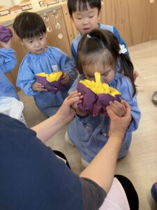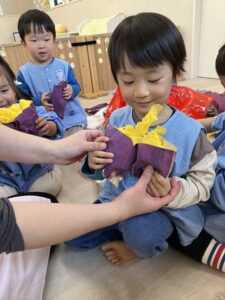 焼き芋が出来上がると嬉しそうに持ち、焼き上がった焼き芋を半分に割りあつあつほくほくの焼き芋をみんなで食べました🥰