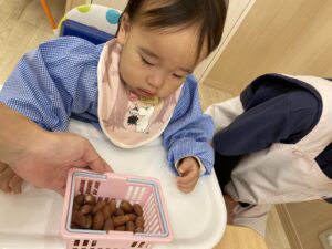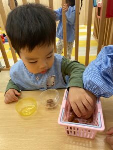 2歳児さんはみんなで一緒に数えながらどんぐりを入れました❣️