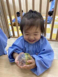 「先週みんなが公園で拾ったどんぐりだよ😊」と伝えると嬉しそうにカゴの中を覗き込んでいましたよ。