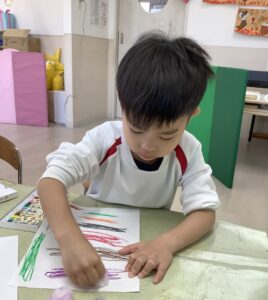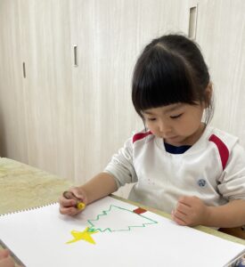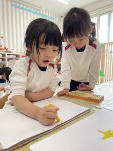 自由遊びの時間では、ツリーの絵を描いてクリスマス気分を味わうさくらんぼ組さんでした🍒