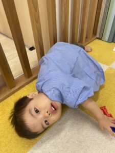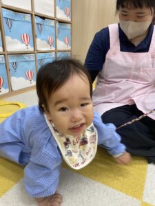 0歳児さんたちはお部屋の中をハイハイで探検をしたり、アンパンマンブロックをして遊びました😁