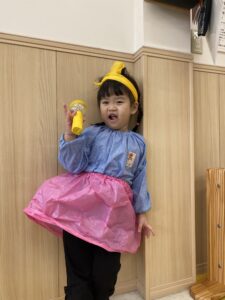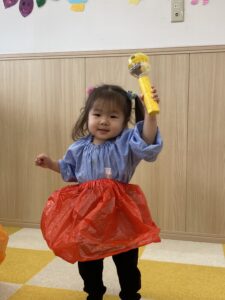 カラーポリ袋のスカートとリボンを着けて気分はアイドル