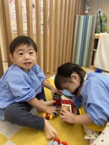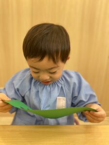 2歳児さんの製作の様子を「まだかな〜、早く僕たちの番こないかな〜」と見ていた1歳児さん。