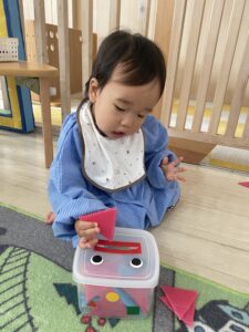 上手に入れることができると「これ!」と指をさして嬉しそう😊