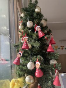 玄関に飾ってあるクリスマスツリーにはかわいいサンタさんたちが飾られていますよ😊