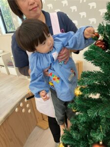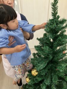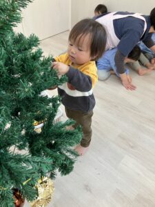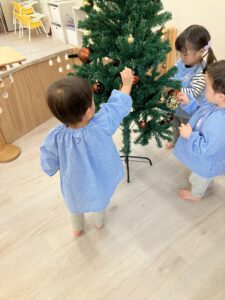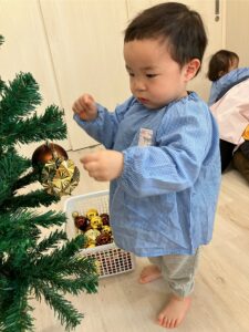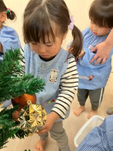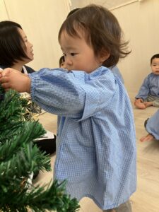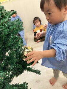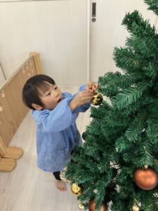キラキラしている玉をどこにつけようかなと悩みながらみんなで順番に飾り付けをしていきました!