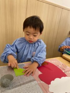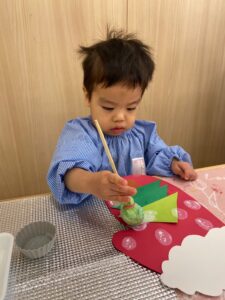 1歳児さんはお山の形をした画用紙をのりで塗ってツリーを作りました✨