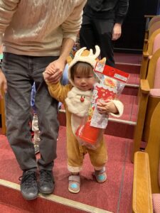 園長先生からサンタさんのプレゼントをもらった子ども達は、嬉しそうにおうちの方に見せていたり…