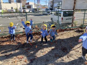 公園には落ち葉がたくさん落ちてたので、落ち葉遊びも楽しみました🍂両手にいっぱい落ち葉を集めて「いっせーのーで!」と皆んなで上に投げ、落ちてくる落ち葉の雨を楽しみました🙂