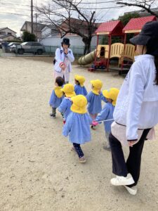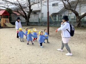 1歳児さんはお散歩ロープを持って歩く練習もしました☺️先生の笛の音に合わせて「いっち!に!」とロープを離すことなく上手に持って歩く事ができました✨