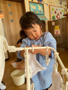 なかなか1人で絞ることは難しいですが雑巾を握ってみたり、ねじってみたりしながら子どもたちなりに工夫して頑張っていました😊✨