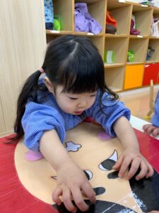 その後は実際にコマ回しに挑戦です!保育者のお手本を見て、「こうかな?」と試しながら回す子どもたちです✨